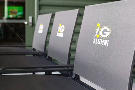 Showcase your brand throughout your outdoor spaces with custom-embroidered sling dining chairs! Virtually anything is possible: company logos, events, schools, organizations, championships, clients, and much more.
