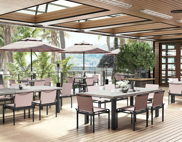 Café seating pieces have an average seat height of 19" and are commonly used in restaurants, bars and other active seating venues. Most café collections are stackable and available with and without arms. Be sure to select café heights for both the table, which has a 30" average height, and the seating collection to ensure proper fit. No matter which seating type you choose, all are built to withstand extreme weather conditions.