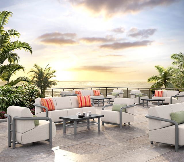 The Boden collection’s clean, architectural lines and tubular frame offer a bold, modern silhouette. Its seamless curves and integrated armrests create a sense of flow, while the plush, High Resilient cushions invite you to sit back and breathe deep. Boden’s sleek lines and contemporary appeal are matched by exceptional durability and weather resistance. Crafted with powder-coated aluminum and all-weather cushions, Boden is made to withstand the elements while offering luxurious comfort season after season.